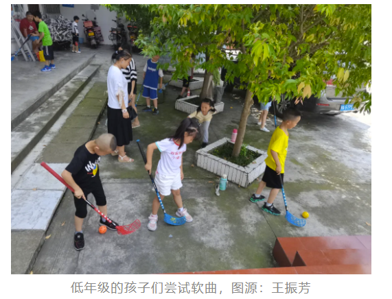 “这是一项非常灵活的体育运动,场地限制较小,只要有平地就能打。而且球员的数量不固定,对孩子们的身高等先天性条件要求不高,大家都可以参与。”听完介绍后,王振芳和团队还会鼓励老师们尝试用球杆击打自己的身体,通过这种方式感受球杆的力量。起初,由于孩子们对新运动的陌生,很少有孩子愿意主动尝试软式曲棍球。但在老师的协助下,协会与学校挑选了一些平时就比较喜欢运动的同学,“让他们先试一试”。