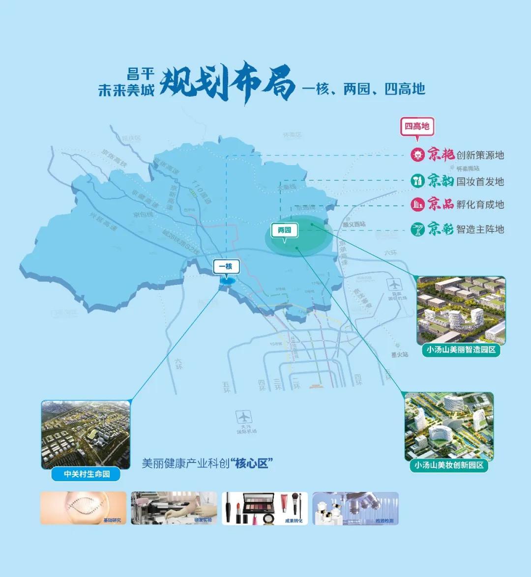 “一核”为美丽健康产业科创“核心区”,充分发挥全球领先的“生命谷”创新优势和“两区”政策优势;“两园”为小汤山美丽智造园和小汤山美妆创新园,通过差异化定位形成创新与智造相融合的“两园互动”发展格局;“四高地”为“京艳创新策源地+京韵国妆首发地+京品孵化育成地+京彩智造主阵地”,着重构建产、学、研、用、检协同发展的产业链条,多维支持化妆品产业发展。
