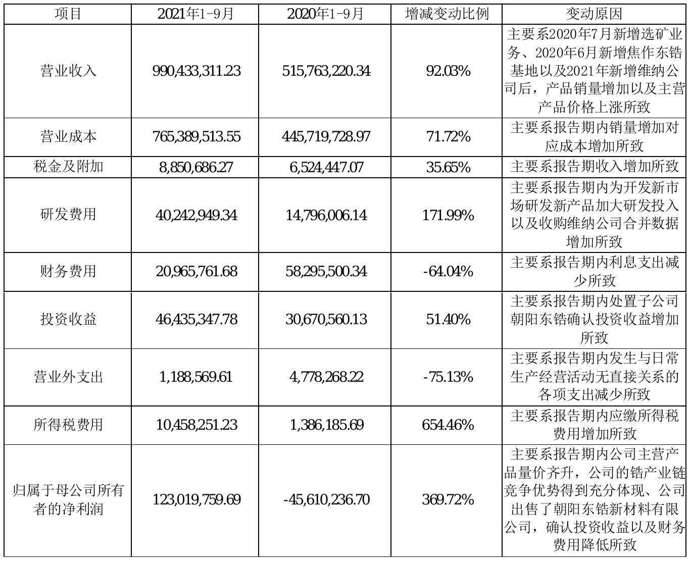 挖贝网10月18日,东方锆业(002167)近日发布2021年前三季度报告,报告期内营业收入990,433,311.23元,同比增加92.03%;净利123,019,759.69元,同比扭亏为盈。