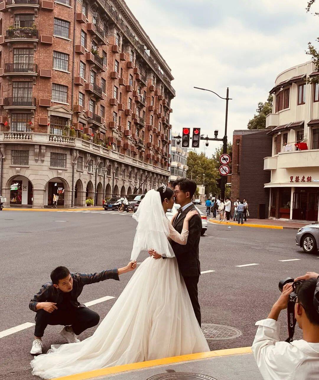 每天不论晴空万里还是阴雨绵绵,都会聚集了众多相机的焦点。有不少摄影师也选在武康大楼拍婚纱照