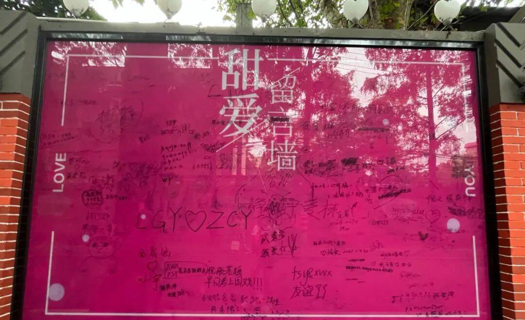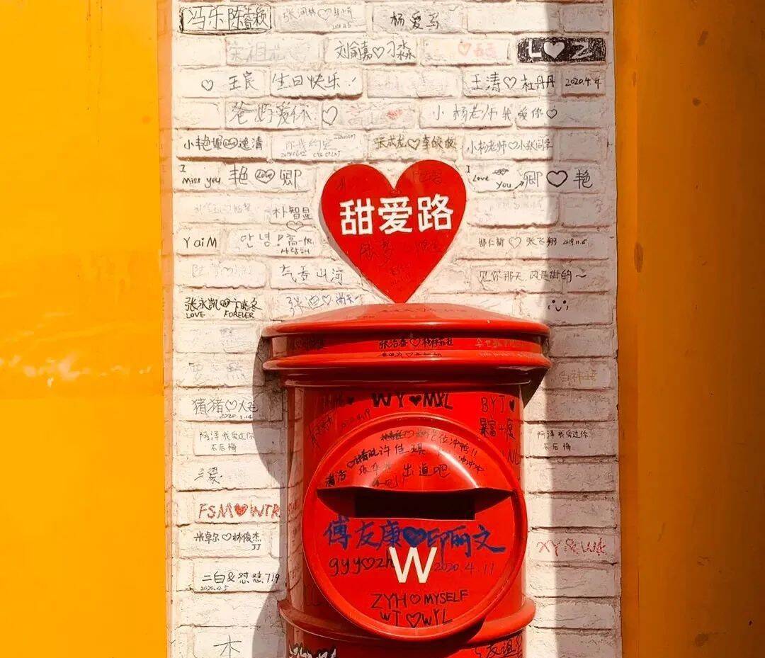 甜爱路的标志性元素就是红色的甜爱邮桶,上面写满了名字