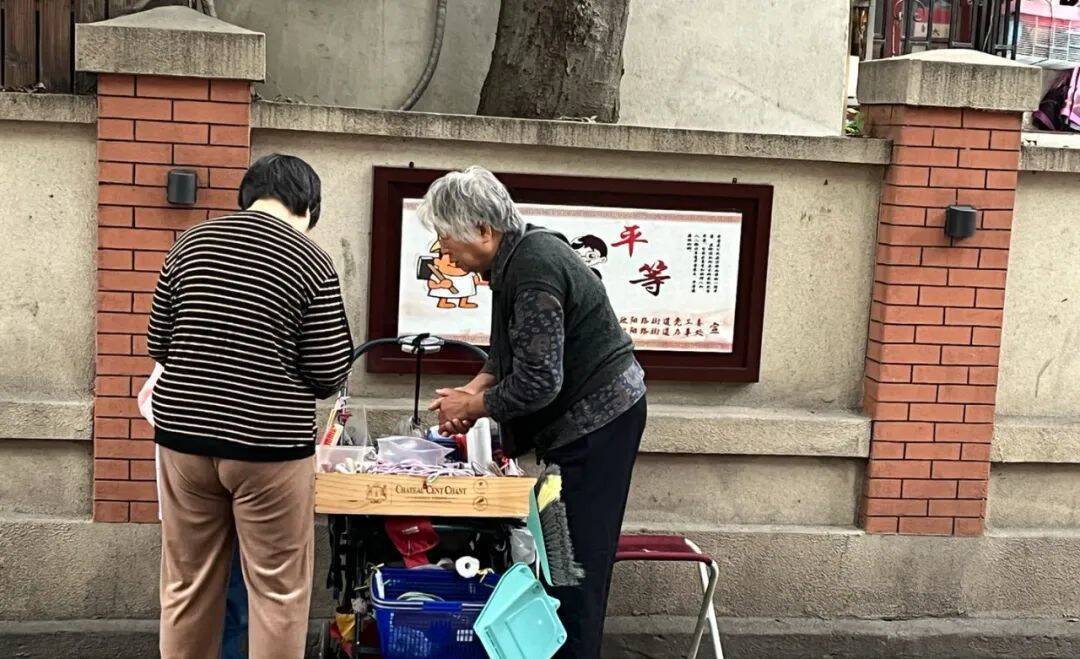 也有老人推车在街道口摆小摊,卖一些扫把、皮筋、针线等小零件。你看,哪怕没有多少东西,仍是有人来买的