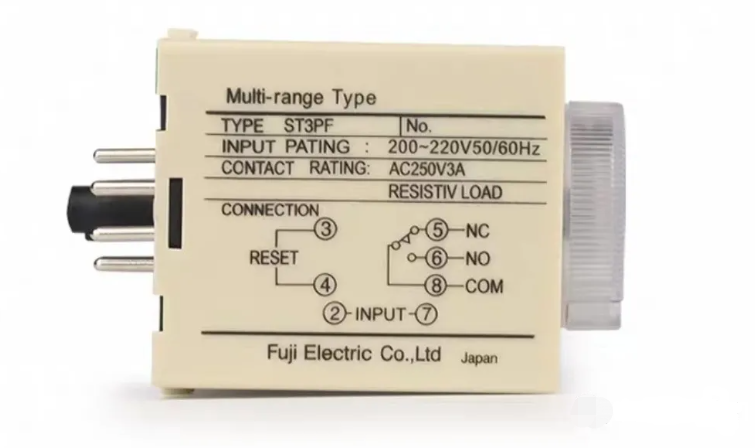 ST3PA断电延时时间继电器,2、7端子为电源线,3、4为复位按钮,5、6、8为延时触点,5、8为常闭触点,6、8为常开触点。