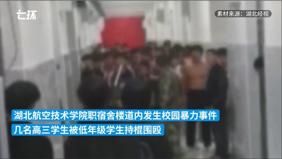 10月16日,湖北鄂州。据湖北经视,湖北航空技术学院发生一起校园暴力事件,几位高三学生在宿舍楼道内遭到一群低年级学生持棍围殴,共造成9名学生受伤,警方已介入。