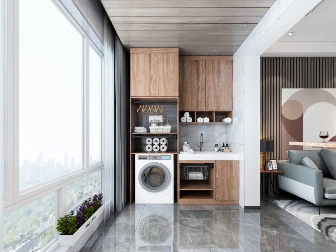 2. 加强洗衣机、烘干机的固定,减少机器晃动,还可以定制封闭式家政柜,将机器放进去,增加阻断;