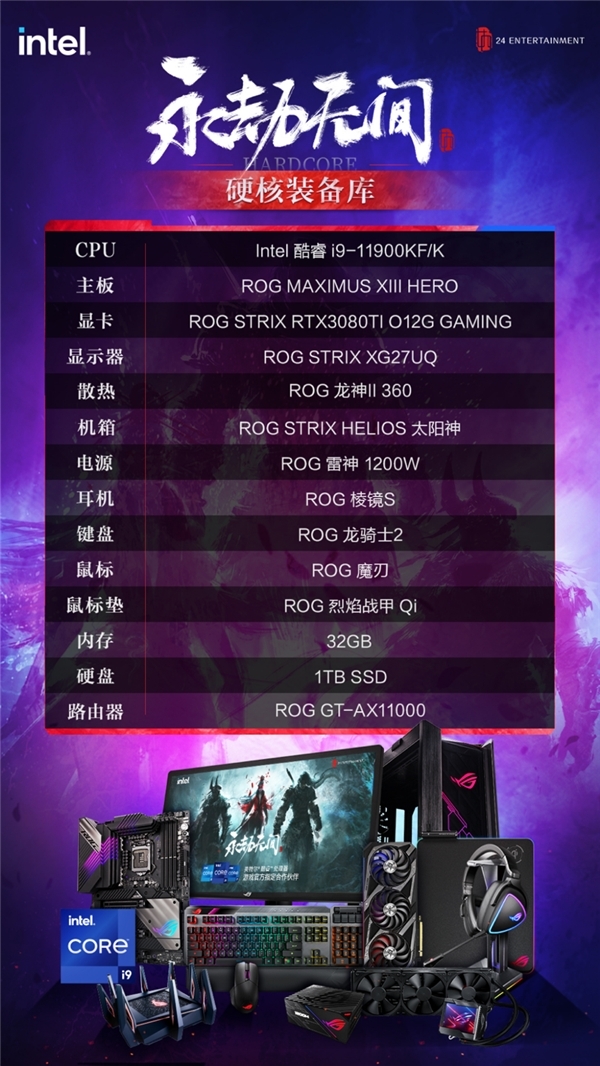 根据推荐配置,在此为大家分享一套第11代酷睿游戏平台:以华硕ROG MAXIMUS XIII HERO主板为核心,搭配Intel酷睿i9-11900KF处理器、ROG-STRIX-RTX3080TI-O12G-GAMING显卡等配件,还有全方面硬核升级,尽显强悍性能。