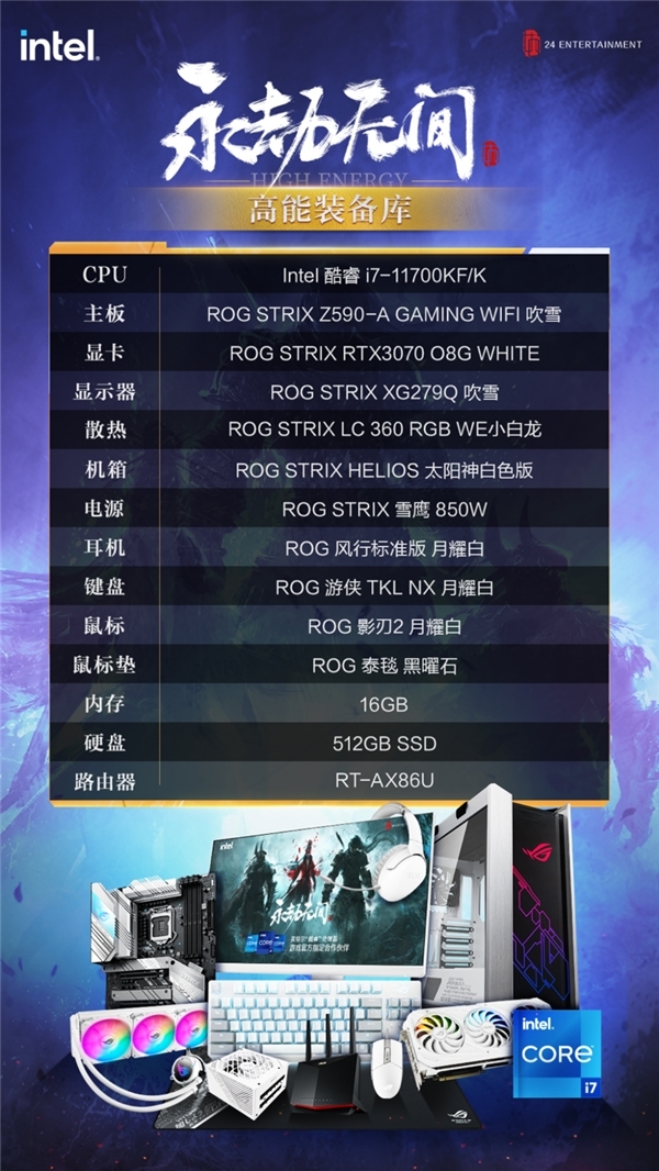 根据推荐配置,在此为大家分享一套最新第11代酷睿游戏平台:以华硕Z590吹雪主板为核心,搭配Intel酷睿i7-11700KF处理器、ROG-STRIX-RTX3070-O8G-WHITE电竞显卡等配件,还有ROG玩家国度全家桶信仰之力加持,颜值爆棚,战力爆表!