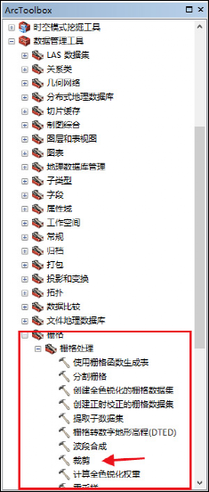 工具在:ArcToolbox-->数据管理工具-->栅格-->栅格处理-->裁剪(ArcToolbox-->DataManagerment Tolls-->Raster-->Raster Processing-->Clip)。