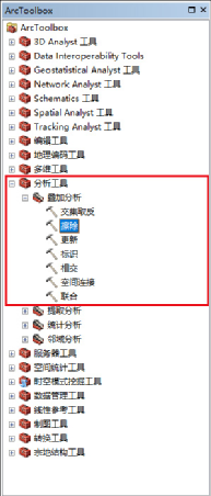 工具位于:ArcToolbox-->分析工具-->叠加工具-->擦除(ArcToolbox-->AnalysisTools-->overlay-->Erase)。
