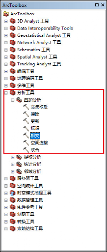 工具位于:ArcToolbox-->分析工具-->叠加工具-->相交(ArcToolbox-->AnalysisTools-->overlay-->Intersect)。