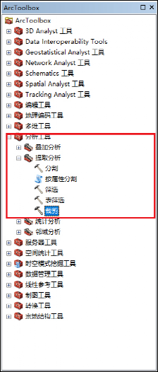 工具位于ArcToolbox-->分析工具-->提取-->裁剪(ArcToolbox-->Analysis Tools-->Extract-->Clip)。