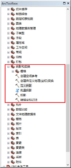工具位于:ArcToolbox-->数据管理工具-->投影和转换(ArcToolbox-->Datamanagerment Tolls-->Projections andTransformations)。