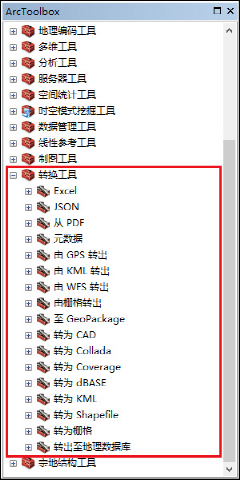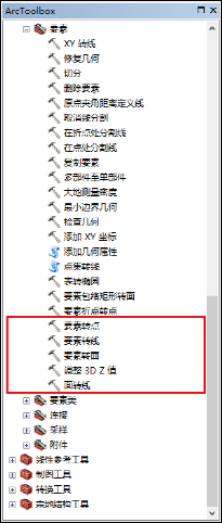 要素之间的转换包括点线面要素类型之间的相互转换,工具位于:ArcToolbox-->数据管理工具-->要素(ArcToolbox-->DataManagerment Tolls-->Raster)下。