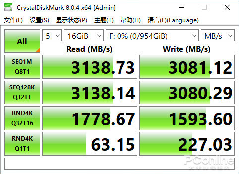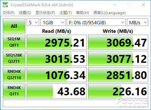 在空盘状态下,使用CrystalDiskMark测试软件对硬盘进行默认读写速度测试。在1GB大小的测试中,Seq Q8T1顺序读取速度为2975.21MB/s,顺序写入速度为3069.47MB/s,16GB大小的测试中,Seq Q8T1顺序读取速度为3138.73MB/s,顺序写入速度为3081.12MB/s,顺序读取与官方标称有些差距,但写入速度基本符合标称,可能是硬件差异造成。
