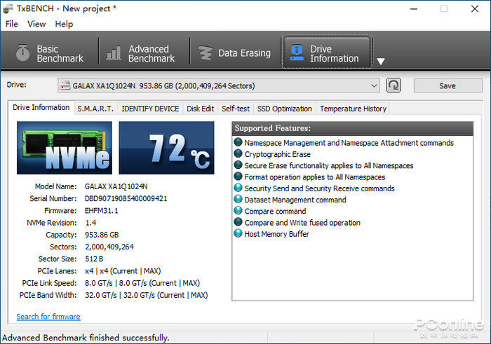 从TxBENCH软件中可以看到硬盘的可用空间为953.86GB,还发现这款硬盘支持Host Memory Buffer(主机内存缓存)功能。通过此功能,可以让硬盘向主机内存借用一定的闲置空间,来实现FTL映射表存取,从而提高SSD的读写性能。