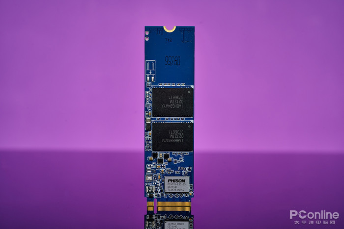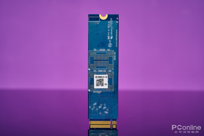 接下来我们拆去硬盘的马甲和标贴,硬盘为蓝色PCB,单面颗粒布局,正面有两颗NAND颗粒,硬盘主控可以看到来自群联,DRAM-less设计。