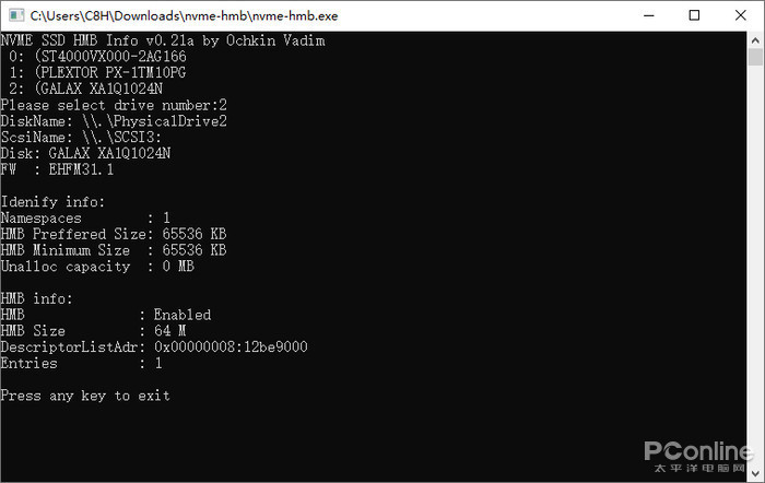 我们使用nvme-hmb工具进行查看,可以看到硬盘支持最大64MB的共享缓存,达到了Windows系统StorNVMe驱动限定的最大值。