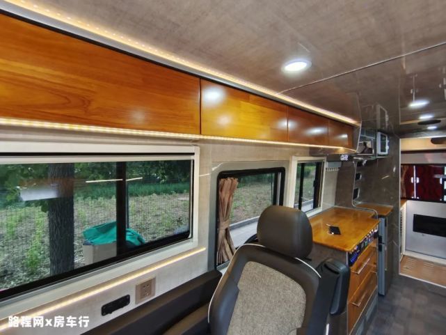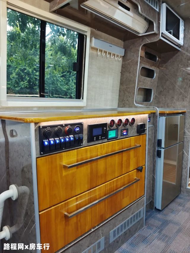 为减少车内做饭油烟泛滥的问题,这款车把厨房区分为两个部分,一体式橱柜位于外部,超大的操作台面满足你大展身手的需求,做饭时也不用因面积不够而畏手畏脚;烹饪区则在尾部,与生活舱分隔开来;
