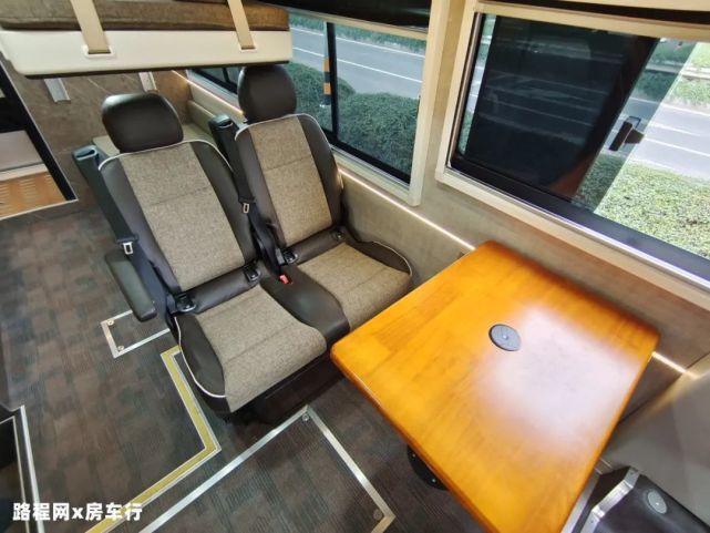 会客区位于车厢中部,采用2+1的布局,座椅带有安全带方便行车时载人,同时还有扶手、头枕增加乘坐舒适度,长途旅行时,久坐不易疲劳,旅行更舒心;双人座椅位于左侧,前方设有餐桌可供日常休闲娱乐使用;侧方有电源插座可供手机充电;