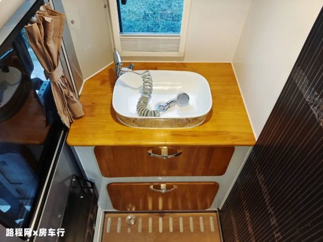 右侧是卫浴区,内部配置了便携式马桶(可选装固定式马桶)、洗漱池、淋浴花洒、抽屉、侧推窗、窗帘等设施,底部铺设沥水板防止地面积水,并有效起到防滑的效果;