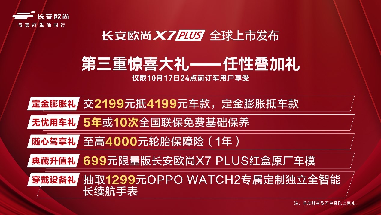 第三重惊喜大礼为任性叠加礼,除手动舒享型车型以外,只要是10月17日24点前订车的用户,均可享受定金膨胀礼(交2199元抵4199元车款,定金膨胀抵车款)、无忧用车礼(5年或10次全国联保免费基础保养),随心驾享礼(至高4000元轮胎保险1年)、典藏升值礼(699元限量版长安欧尚X7PLUS红盒原厂车模)、穿戴设备礼(抽取1299元OPPO WATCH2专属定制独立全智能长续航手表)五大豪礼。