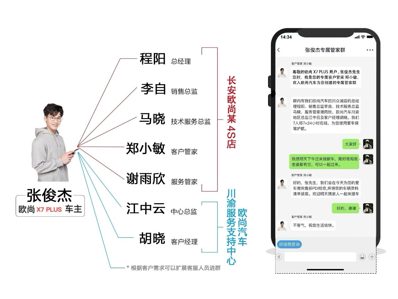 值得注意的是,为了让车主在用车养车过程中遇到的问题能够快速、专业地解决,实现客户全生命周期的关怀,长安欧尚汽车为长安欧尚X7 PLUS车主建立专属管家服务群。该群以1 X的形态构建,即群内只有一名客户(可包含其亲属),多名服务人员(服务人员包含经销商人员和总部职能人员)。专属管家群实现客户问题发起-问题解决-问题满意-问题关闭闭环的全链路管理;基于客户的生命周期,设置了如首保、例保等关怀提醒,基于群内工作人员的服务满意度,向客户推送直评问券等。