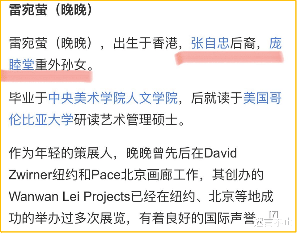 百度百科中有两条关于晚晚的身世介绍:张自忠后裔、庞睦堂重外孙女。