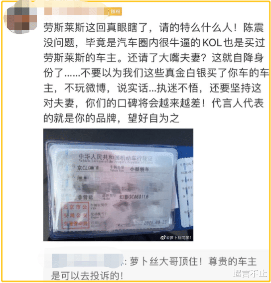 不少车主贴出自己的驾驶证,以证明自己是劳斯莱斯客户,拥有话语权,同时diss劳斯莱斯请人不作背调,被晚晚夫妇一举拉低了产品哔格。