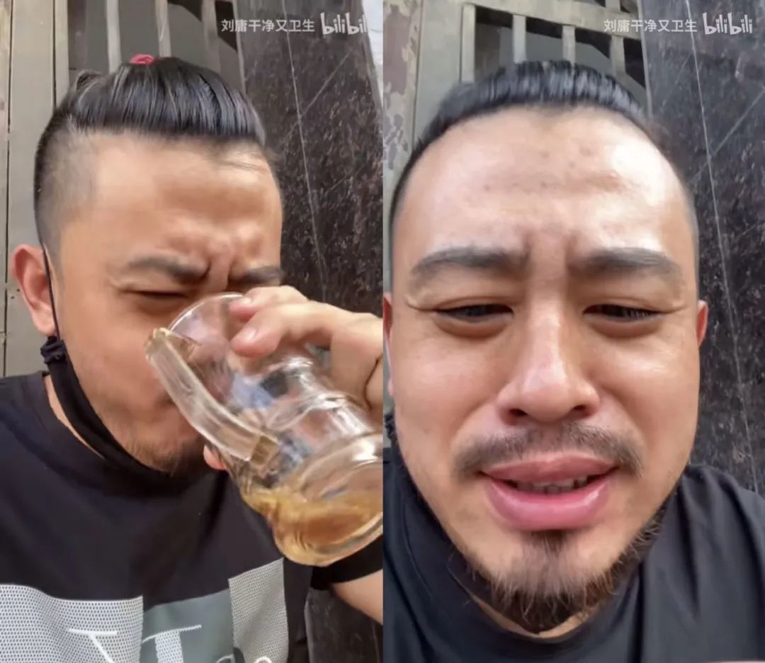 刘庸面露难色,一口气喝完,结果老板又“大气”地给续了半杯,“干净又卫生嗷,兄弟们!”