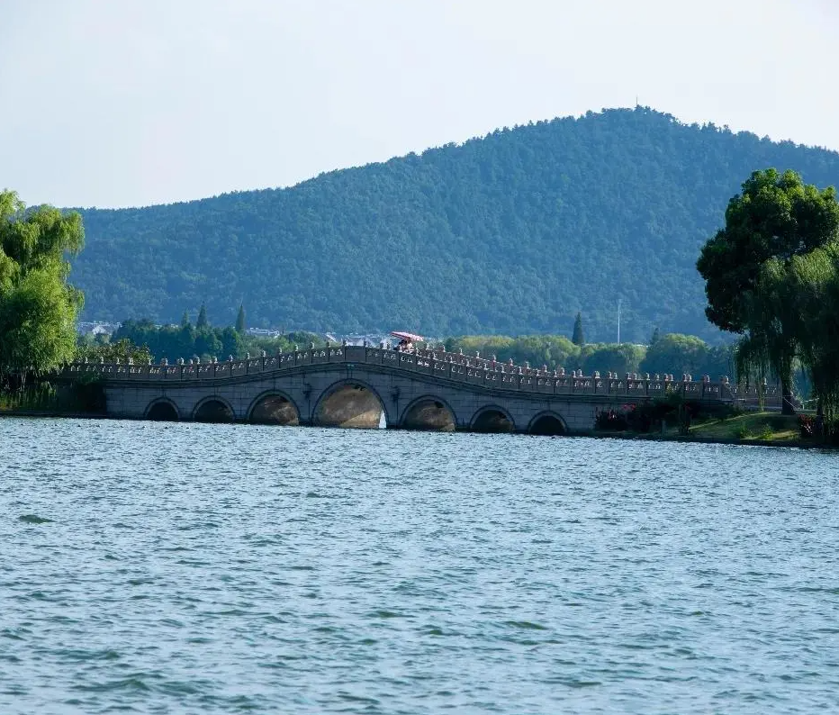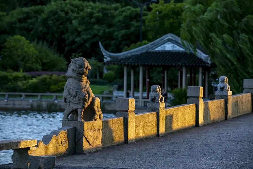 与吴堤相连的石堤,是西石湖和南石湖的分界线,石堤双面临水,堤上有百狮桥,126只形态各异的狮子,寓意美好,是景区最长的一座十九孔桥。