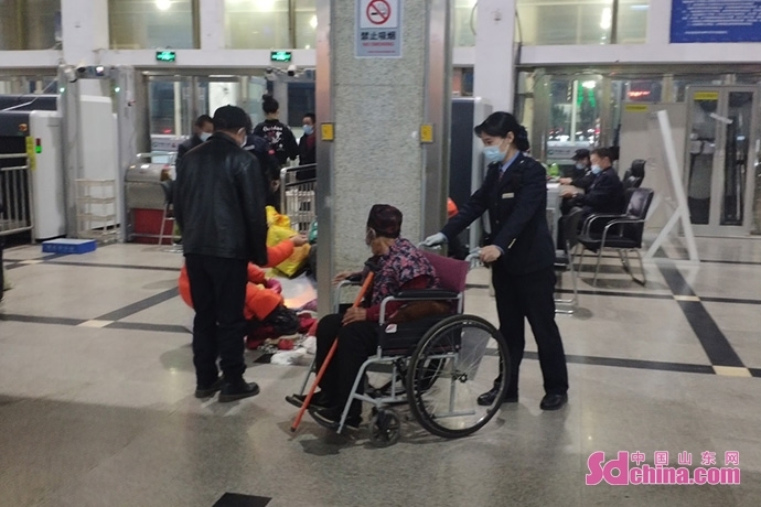 中国山东网-感知山东10月21日讯 (通讯员 吴亚楠) 10月18日晚22点左右,旅客王先生带着90岁高龄的老母亲到济宁火车站,准备坐搭乘5020次列车回老家烟台。因为没有轮椅王先生担心了一路,刚进候车室一位车站女工作人员上前询问情况,将她们二人接到了重点旅客候车区。回忆此事时,王先生说:“当时有点意外,也挺感动。”