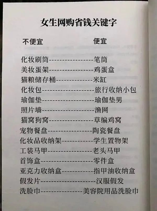 有网购人才按照经验归纳出了一份省钱清单,并在社交平台上广为流传,只要将网购的搜索关键词一替换,平替商品就在眼前。