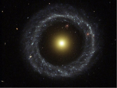 霍格天体是由年轻的蓝色恒星和恒星形成的,其形状是完美对称的环形。这个环形跨越长度约为12.5万光年,完美地环绕在一个直径1.7万光年的黄色老恒星周围。看上去,这两部分中间似乎有着5.8万光年的空白地带。但那中间可能有着暗淡的星团,但是由于距离的原因,我们无法观测到。
