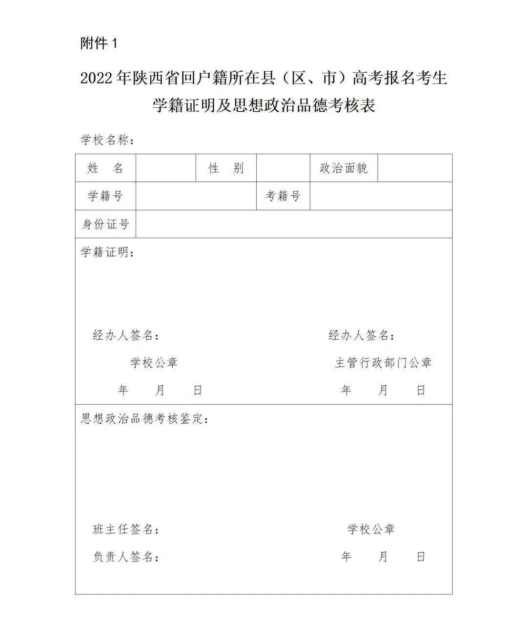 1.2022年陕西省回户籍所在县(区、市)高考报名考生学籍证明及思想政治品德考核表