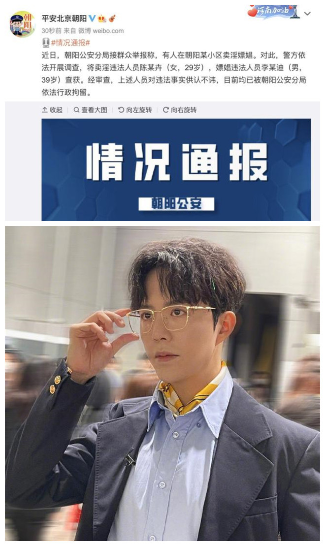 10月21日晚,北京市公安局朝阳分局官方发文,“近日,朝阳公安分局接群众举报称,有人在朝阳某小区卖淫嫖娼。对此,警方依法开展调查,将卖淫违法人员陈某卉(女,29岁),嫖娼违法人员李某迪(男,39岁)查获。经审查,上述人员对违法事实供认不讳,目前均已被朝阳公安分局依法行政拘留。