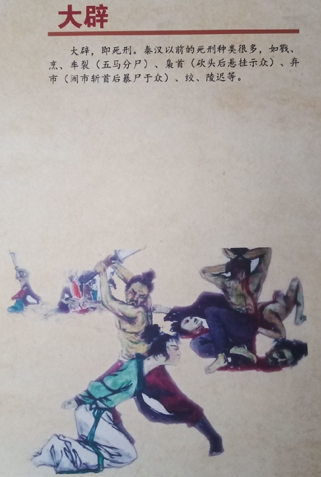 在这里,可以清楚地认知到古代的各类刑罚,如刖刑(斩掉一脚、双脚或去去掉膝盖骨)、车裂(五马分尸)、弃市(闹市斩首后暴尸于市)、宫刑、劓字(割鼻子)等,足以看出古代的法制比当下更为严苛,不论人道。