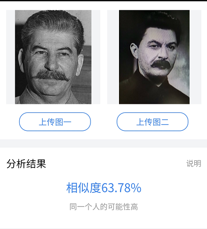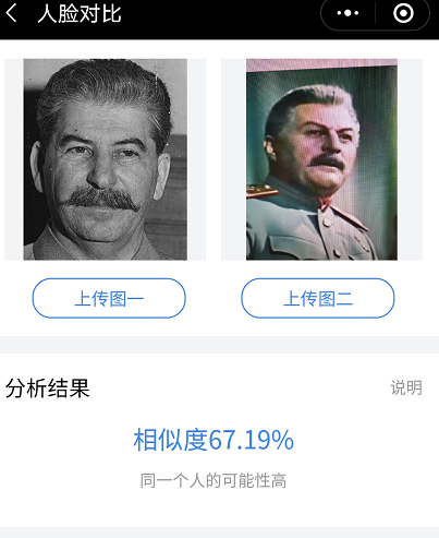 我们选取一张盖洛瓦尼在《保卫察里津》里的镜头,与真实的斯大林照片用“人脸识别”软件比对一下,直接判定为同一人。