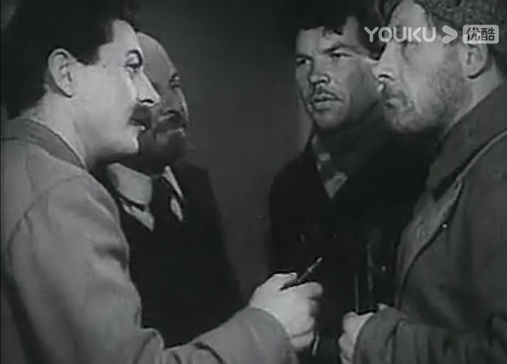 比如,从前线回来的士兵,先与列宁谈话,但是斯大林来到之后,直接抢过了列宁的话头,而镜头里的列宁,也主动让位,把斯大林让到了谈话的主要位置,自己站到旁边上去了。