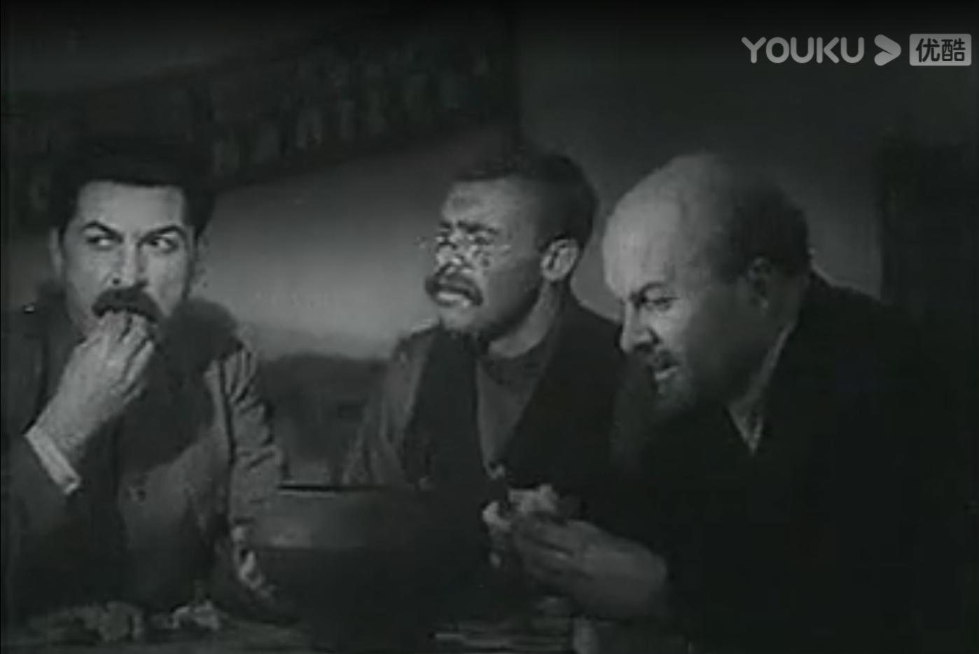 像《带枪的人》中,有一段列宁与斯大林看望士兵们的场景,与士兵一起吃着水煮土豆,其乐融融,反映了领袖的亲民的一面,尤其是列宁在这一段场景中笑出眼泪的表演,还是相当富有感染力的。