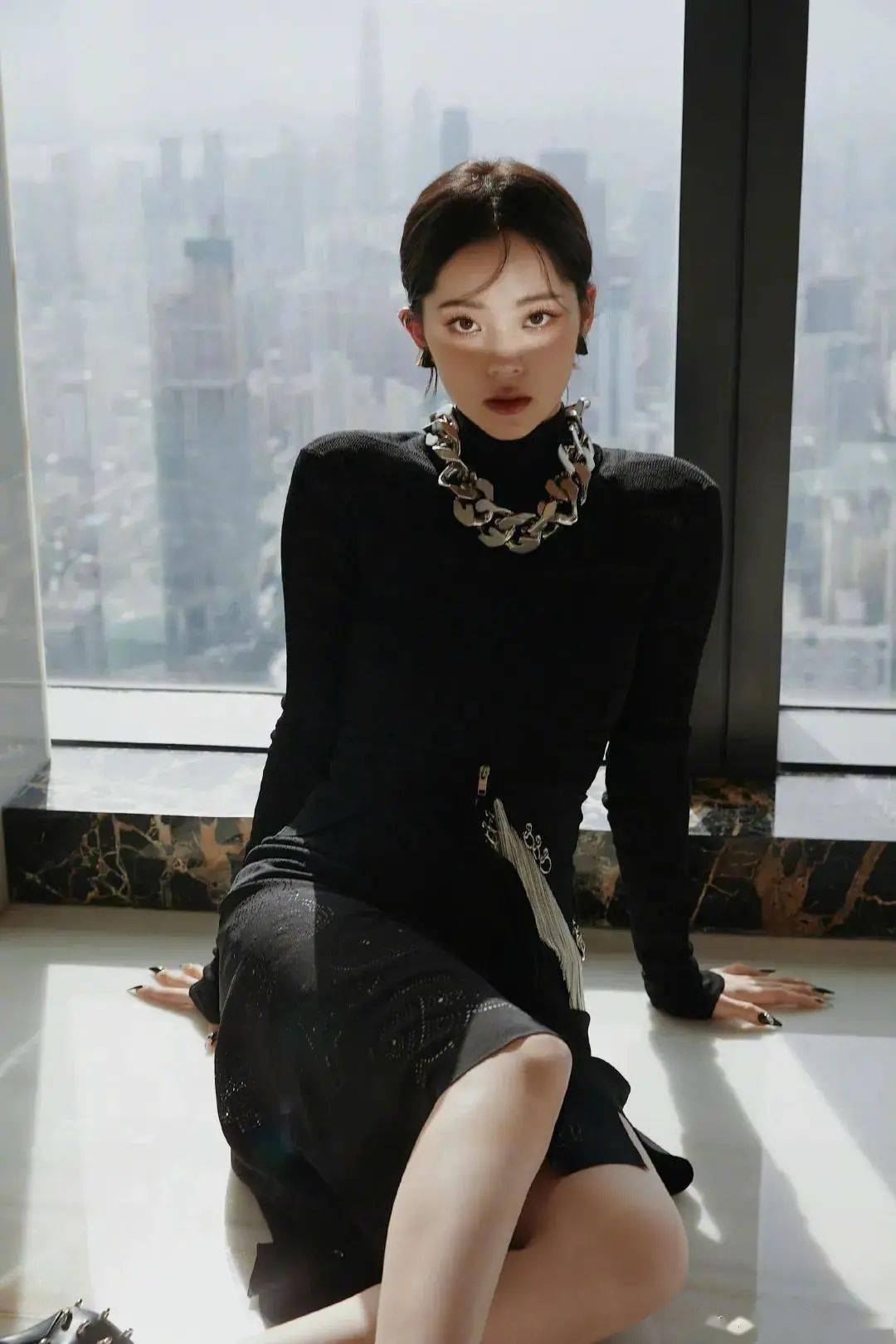 其实这套造型是出自欧阳娜娜前段时间的 Givenchy活动,黑色镂空针织衫和金属流苏半裙的套装,再搭配银色的粗链条chocker,妥妥的养尊处优富家千金大小姐模样。