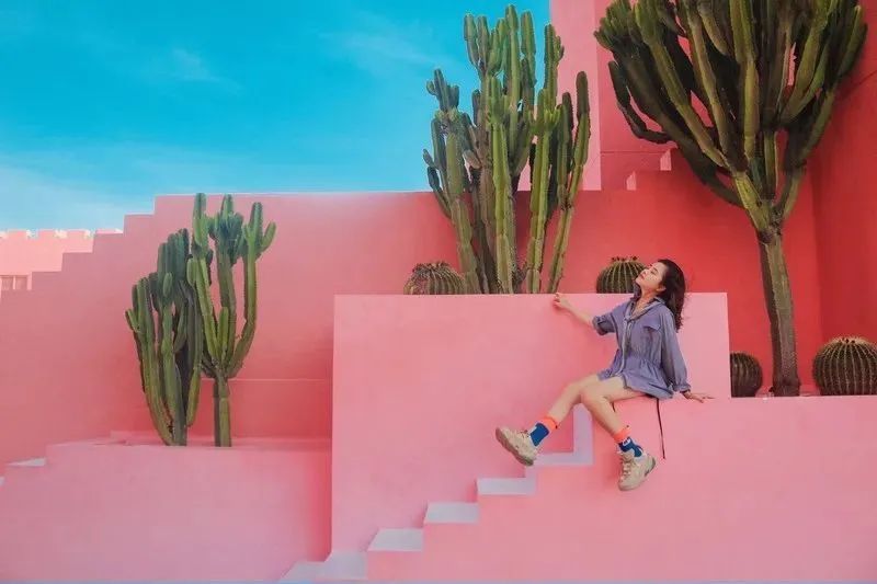 错落有致的红墙、粉蓝相间的搭配,阳光、沙滩、海浪、仙人掌的点缀,非常ins风。