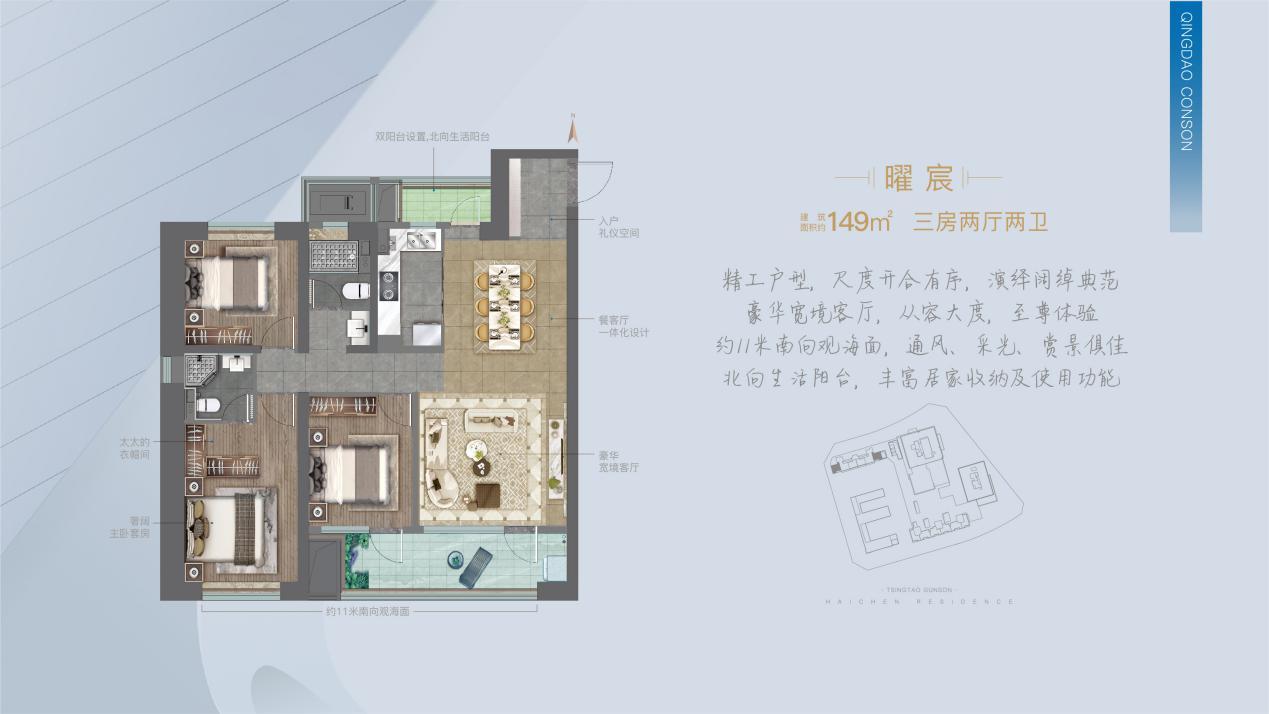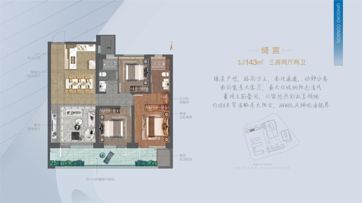 建面约143、149㎡平层空间,设计实现了约10.8米瞰海大阳台、主卧全套房,放大空间的尺度与舒适感,方寸间尽赋美好;