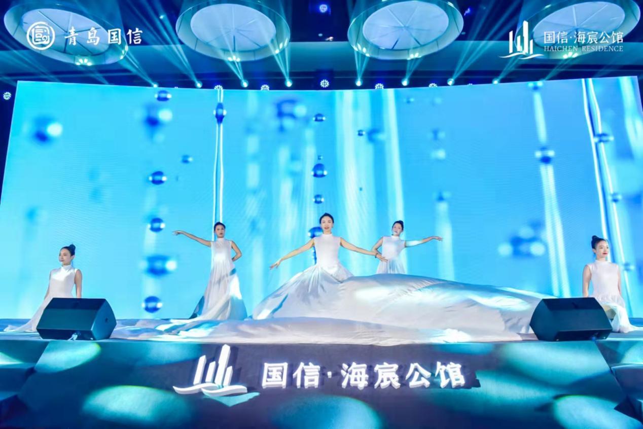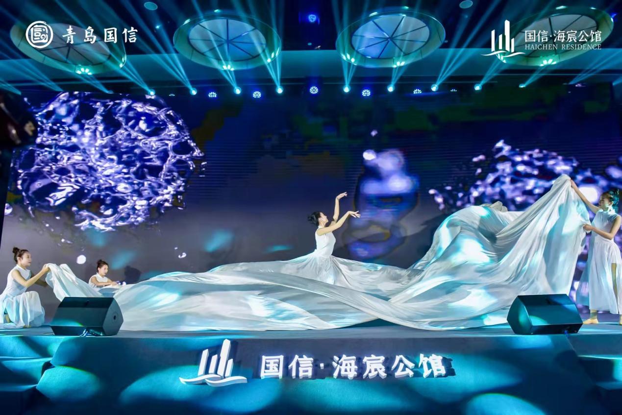 发布会当天,蔚蓝色灯光笼罩,观众仿佛置身海洋,在舞蹈演员宛若游龙穿梭,逸态横生的开场舞之后,国信·海宸公馆项目新品发布会正式拉开序幕。