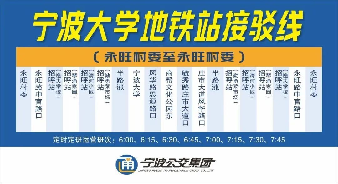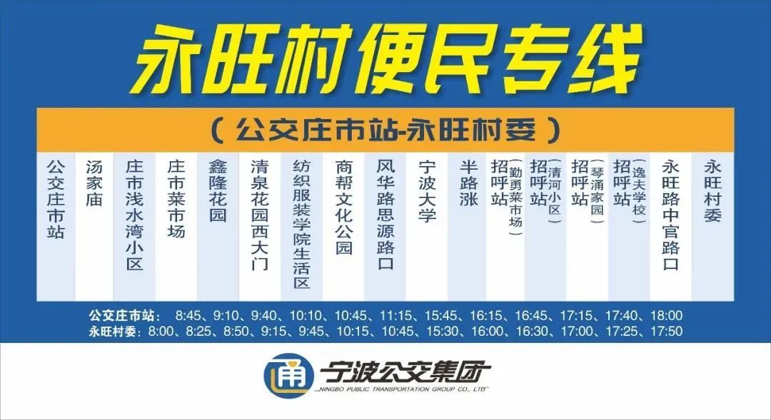 永旺村委、永旺路中官路口、招呼站(逸夫学校)、招呼站(琴涌家园)、招呼站(清河小区)、招呼站(勤勇菜市场)、半路涨、宁波大学、风华路思源路口、商帮文化公园东、宁大学生二村、毓秀路庄市大道口、庄市大道风华路口、半路涨、招呼站(勤勇菜市场)、招呼站(清河小区)、招呼站(琴涌家园)、招呼站(逸夫学校)、永旺路中官路口、永旺村委。