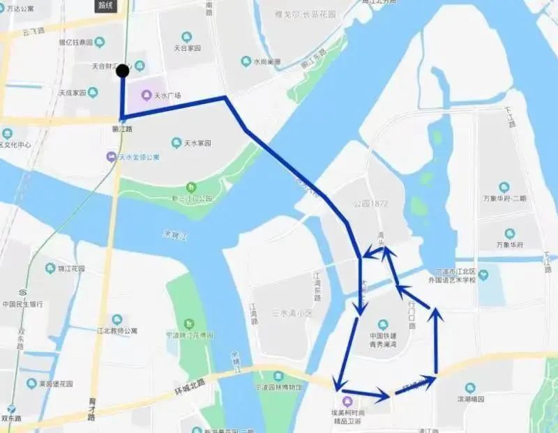 公交天水家园站、天水家园北、湾头大桥北、湾头大桥南、环城北路清河路口、清河路环城北路口、湾头路清河路口、湾头大桥北、天水家园北、公交天水家园站。