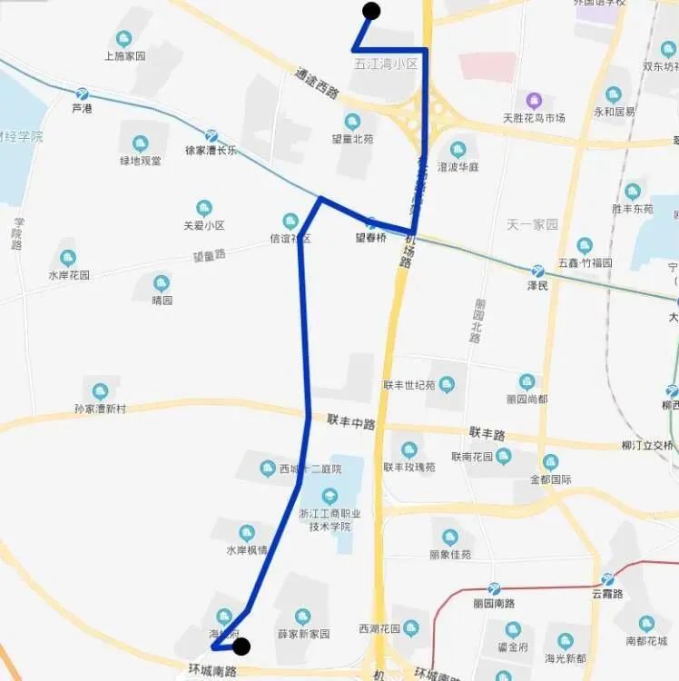 公交薛家站、古林镇中学、薛家南路新典路口↓、浙江工商职业技术学院、薛家南路联丰中路口、薛家北路蓝天西路口、薛家北路龙嘘路口、信谊新村↓、望春桥、五江湾小区、范江岸路望童北路口、公交望童北路站。