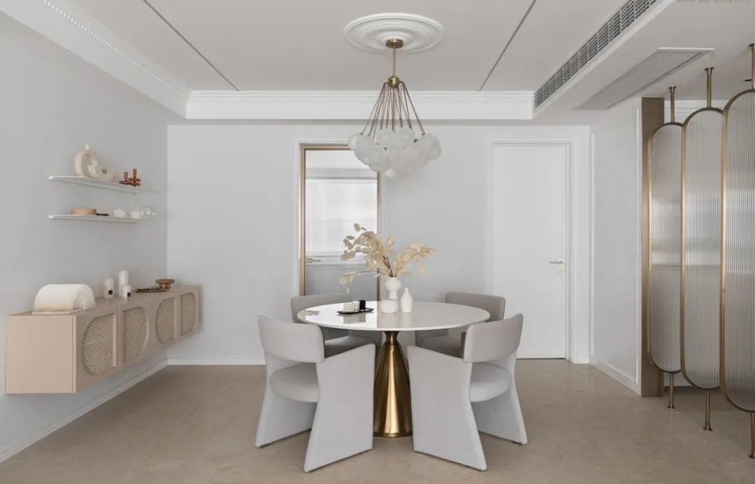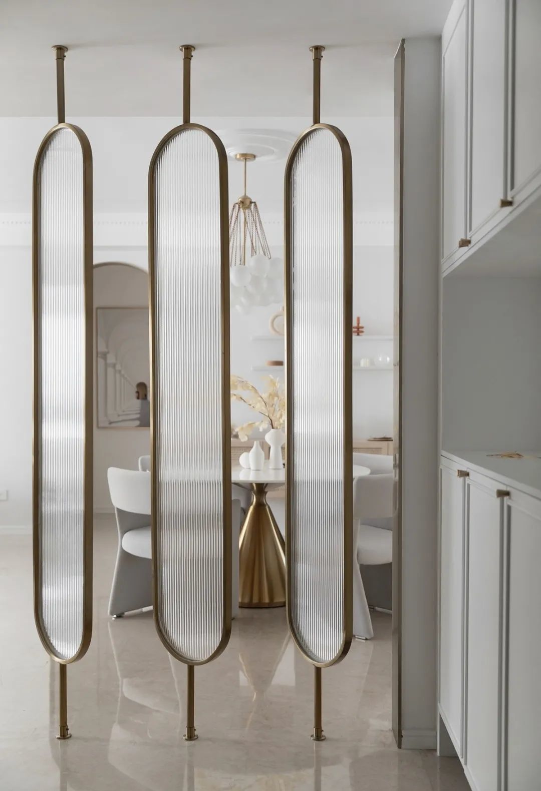 ▲玄关的大门对着餐厅区域,在中间加入3道金属+长虹玻璃的椭圆造型屏风,后方精致的餐桌椅布置若隐若现的效果,一进门就感受到了一种轻奢优雅的高级。右侧鞋柜在底部与中间加入开放空格,装上轻奢的柜门,也让玄关功能实用优雅。