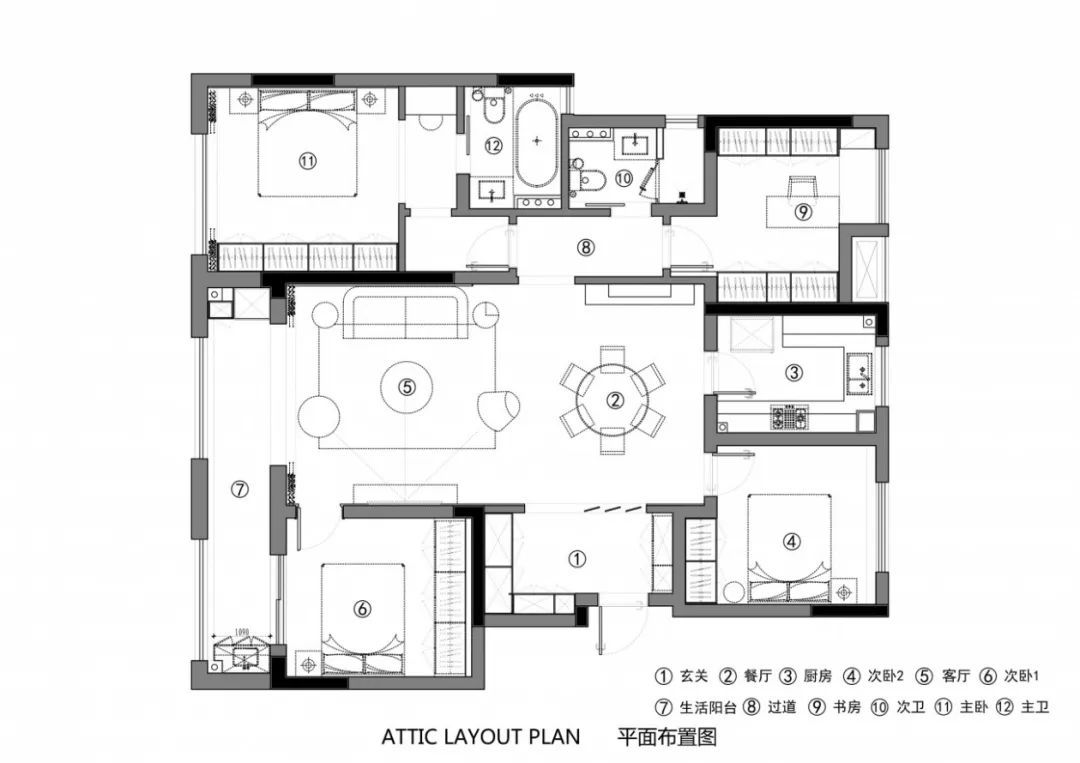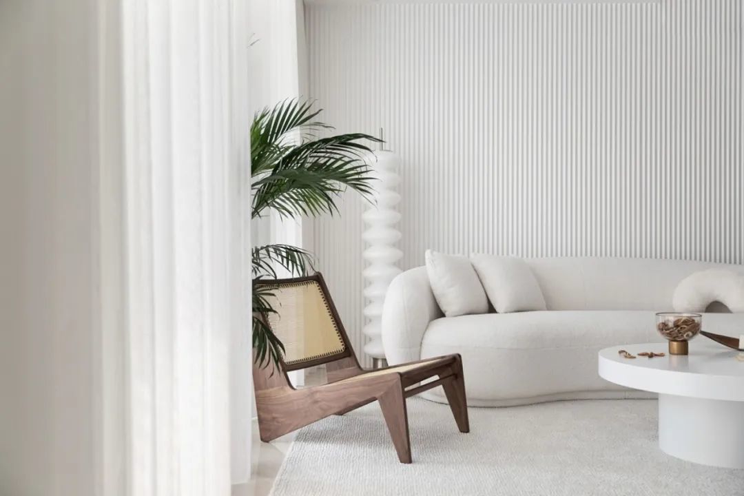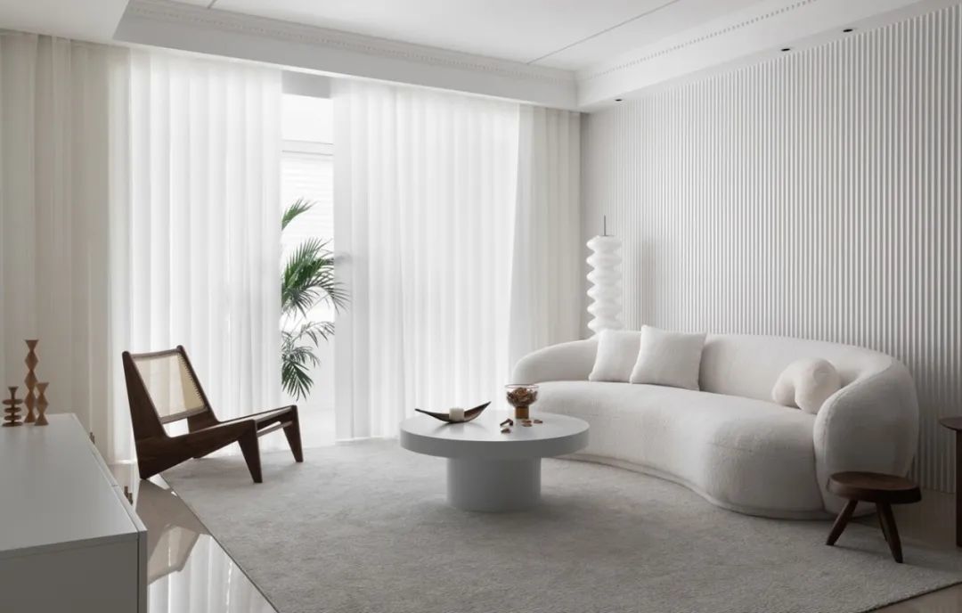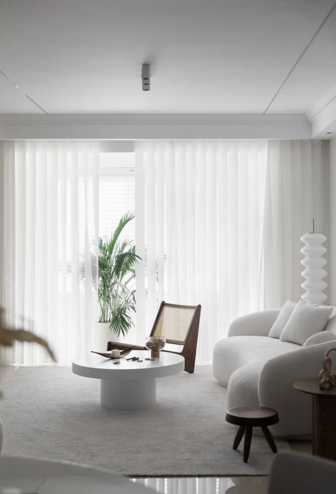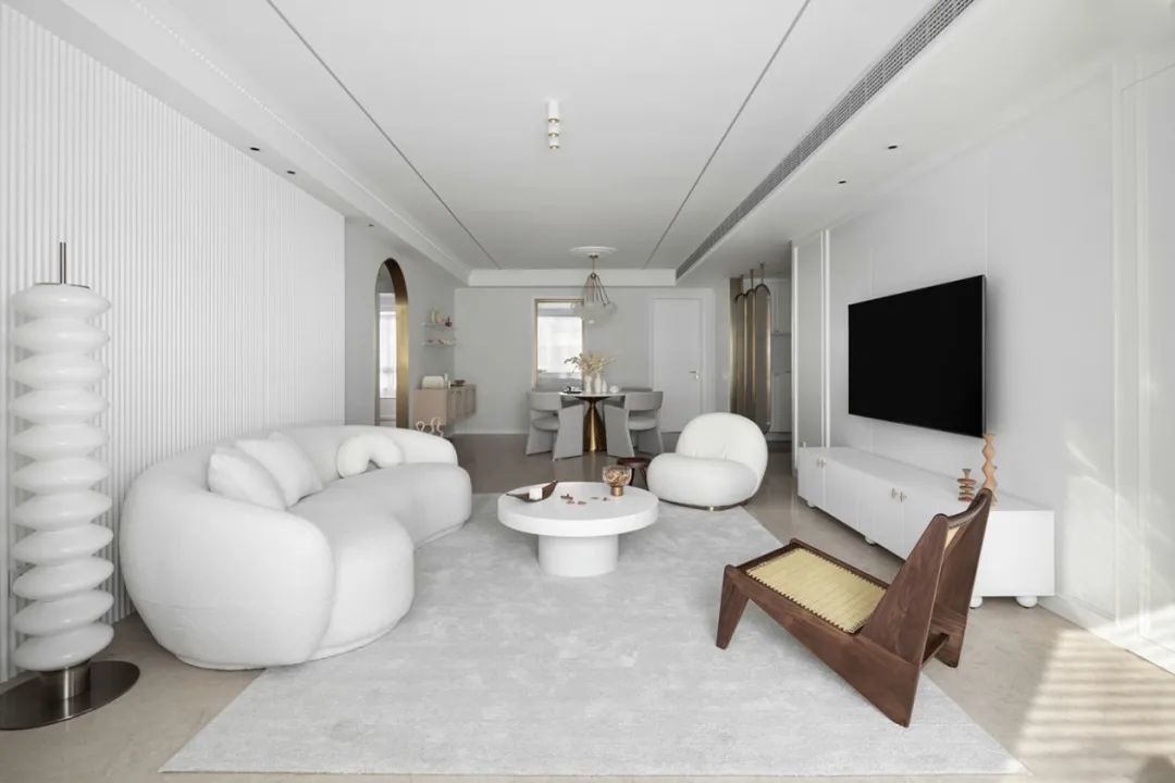 ▲客厅采取无主灯的天花,结合整体素色的硬装+软装,营造出一种朴素极简的设计效果。
