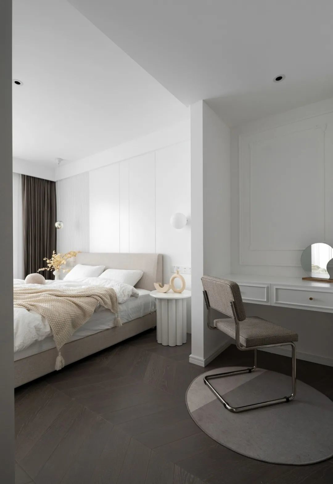 ▲卧室旁边的小角落还加入了一个小梳妆台的位置,椅子下还有一张圆形地毯,为主人营造了一个轻松优雅的化妆小角落。