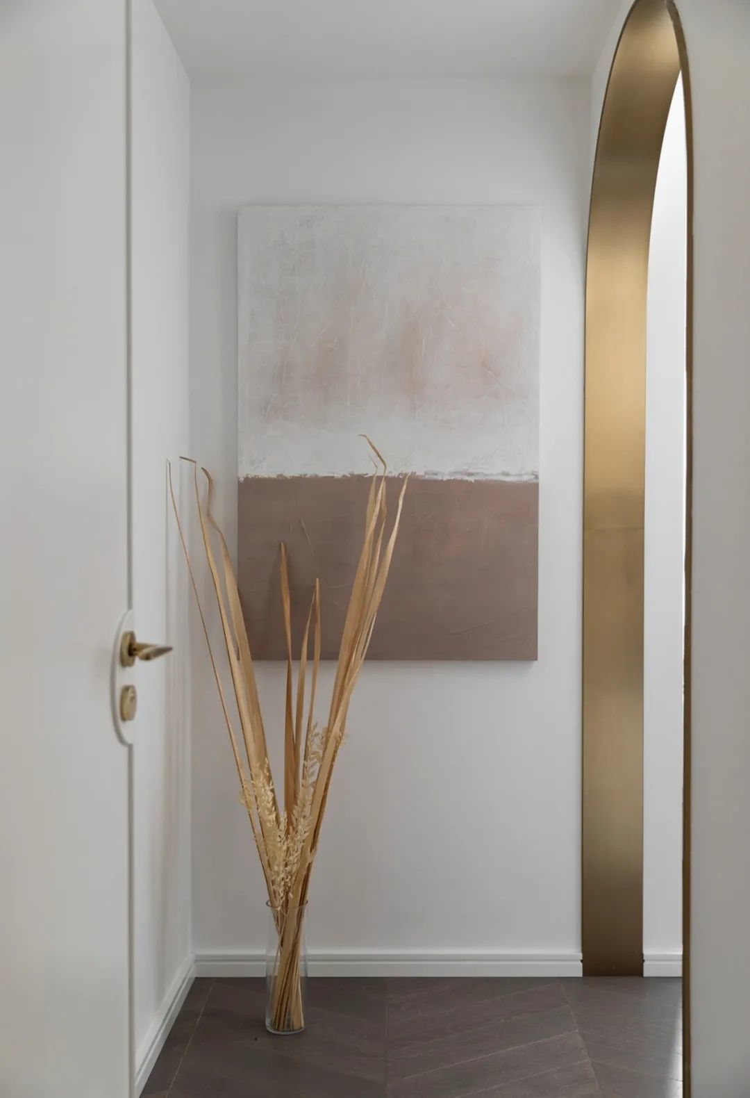 ▲进入卧室,首先是一个小“玄关”的过渡空间,墙面的棕色-白色渐变的朴素装饰画,下方还有一个小玻璃花瓶,插上干枝叶的装饰,搭配金色不锈钢的拱形门洞装饰,带来一种独特的朴素与精致感。